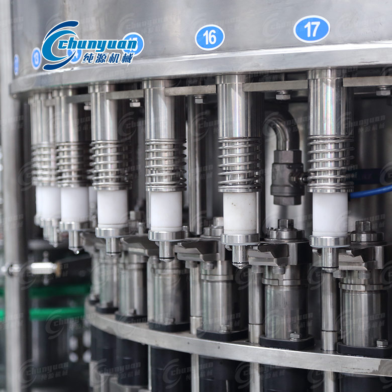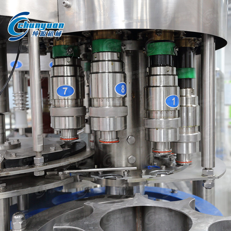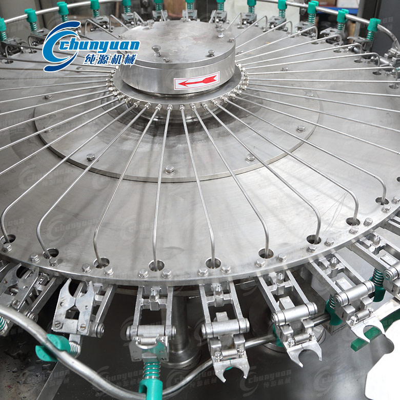 进入水灌装设备的瓶子由瓶颈托板卡住并在凸轮作用下将瓶子上升,然后由瓶口将灌装阀顶开。灌装采用重力灌装方式。灌装阀打开后物料通过灌装阀完成灌装过程,灌装结束后瓶口下降离开灌装阀,瓶子通过卡瓶颈过渡拨轮进入旋盖机。旋盖机上的止旋刀卡住瓶颈部位,保持瓶子直立并防止旋转。旋盖头在旋盖机上保持公转并自转,在凸轮作用下实现抓盖、套盖、旋盖、脱盖动作,完成整个封盖过程。成品瓶通过出瓶拨轮从旋盖机传送到出瓶输送链上,由输送链传送出