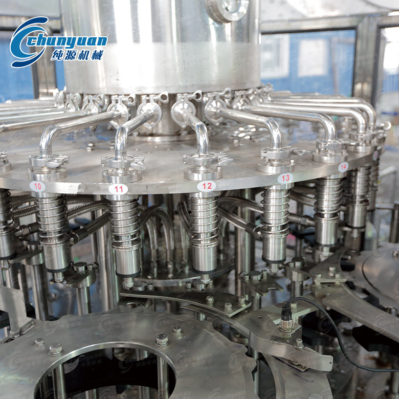 橙汁饮料灌装机。进入灌装设备的瓶子由瓶颈托板卡住并在凸轮作用下将瓶子上升,然后由瓶口将灌装阀顶开。灌装采用重力灌装方式。灌装阀打开后物料通过灌装阀完成灌装过程,灌装结束后瓶口下降离开灌装阀,瓶子通过卡瓶颈过渡拨轮进入旋盖机。