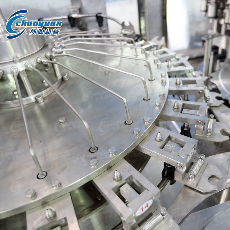 瓶子由通过风送道传递,然后通过拨瓶星轮传送至三合一机的冲瓶机。冲瓶机回转盘上装有瓶夹,瓶夹夹住瓶口沿一导轨翻转180°,使瓶口向下。在冲瓶机特定区域,冲瓶夹喷嘴喷出冲瓶水,对瓶子内壁进行冲洗。瓶子经冲洗、沥干后在瓶夹夹持下沿导轨再翻转180°,使瓶口向上。